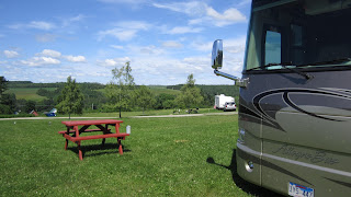 The whole campground was in tip top shape: very well maintained, the sites were level and the grass and flowers were at their best. Looks like the campground could host a few rallies. It has a couple of big tents and a nice sized room for other events. I think some folks were staying here before heading northeast into New Brunswick, Canada. I rated them pretty high (9) on RV Park Reviews (my #1 source of campground info).